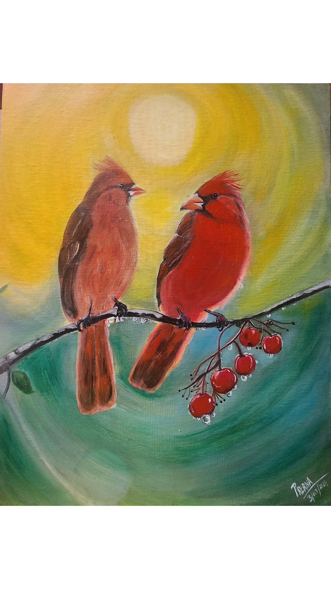 Is absolutely breathtaking! The vibrant reds of the cardinals against the soft golden sunrise create such a warm and uplifting energy. The artist has captured the movement of the birds so beautifully, and it fills the entire scene with optimism. It’s the kind of piece that instantly brightens up a room and brings a sense of joy and good fortune with it.